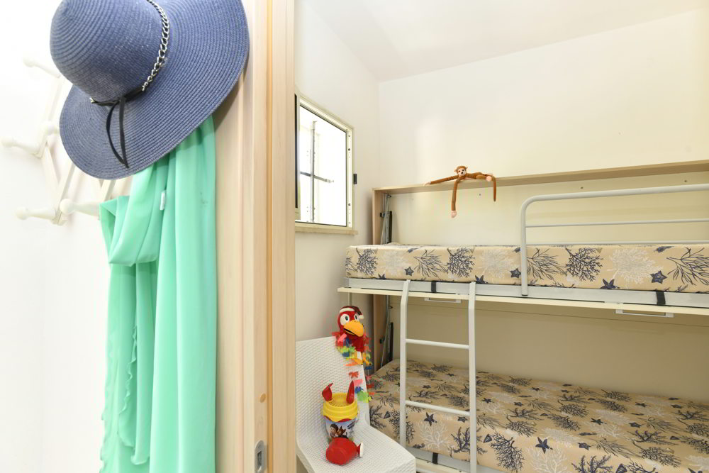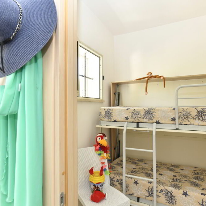Questo trilocale al piano terra è la soluzione ideale per chi cerca comfort e praticità in un ambiente ben organizzato. L’interno, con spazi pensati per ospitare famiglie, offre un soggiorno pranzo con angolo cottura, un divano letto (o letto piano), una camera matrimoniale e una piccola cameretta con letto a castello. Il bagno è dotato di box doccia per garantire il massimo della funzionalità.